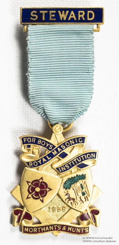 На ножках циркуля размещены два малых герба провинции Нортге́мптоншир — церемониальное неметропольное графство в центре Англии. Название провинций Northants&Hunts отражено на ленте красной эмали внизу знака.