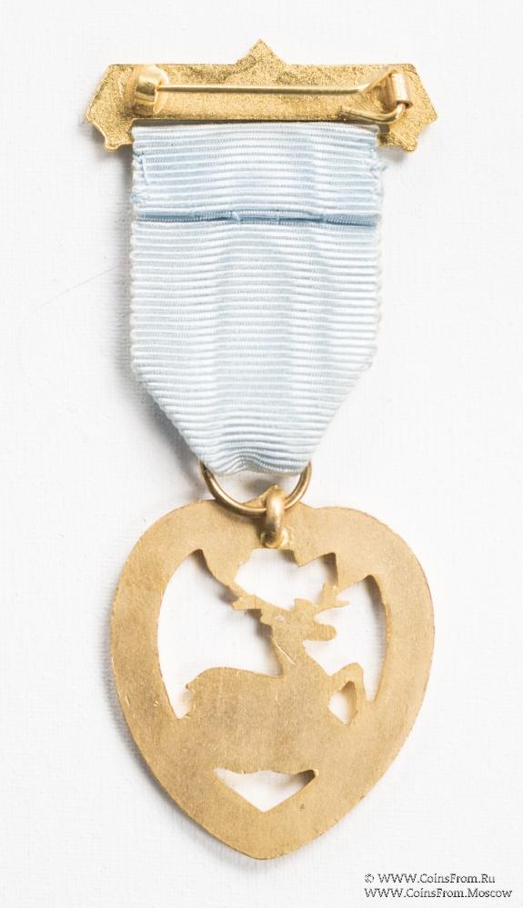 Знак в форме сердца из голубой ленты с названием благотворительного института. В центре фигура лежащего оленя и ниже дата 1974.