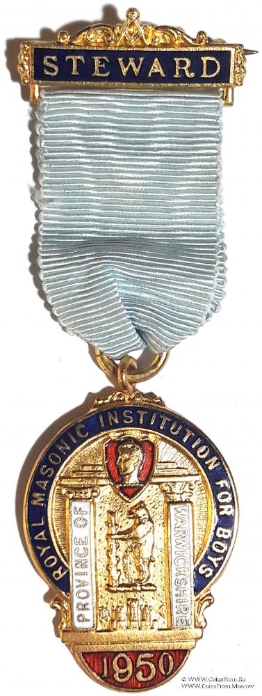 Круг из синей эмали с названием института. Внутри две символические колонны с названием провинции. Между колоннами изображение 3 крепостных башен и солнца, над которыми фигура Медведя в кандалах в ошейнике и с посохом. Символ провинции Warwickshire. Ниже полукруг с датой 1950. Над колоннами в лучах треугольный щит с головой в профиль.