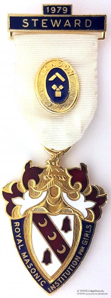 В центре знака герб. Белый щит с правой красной перевязью. На перевязи изображение трёх полумесяцев. Сверху и снизу от перевязи по колоколу красной эмали. На щите шлем. Над шлемом на бурлете клейнод заканчивающийся рукой сжимающей жезл. Шлем и навершие окружены намётом красно-белой эмали. В нижней части щита лента синей эмали с наименованием благотворительного института. STEWARD ROYAL MASONIC INSTITUTION FOR GIRLS. – Королевский Масонский институт для девочек.