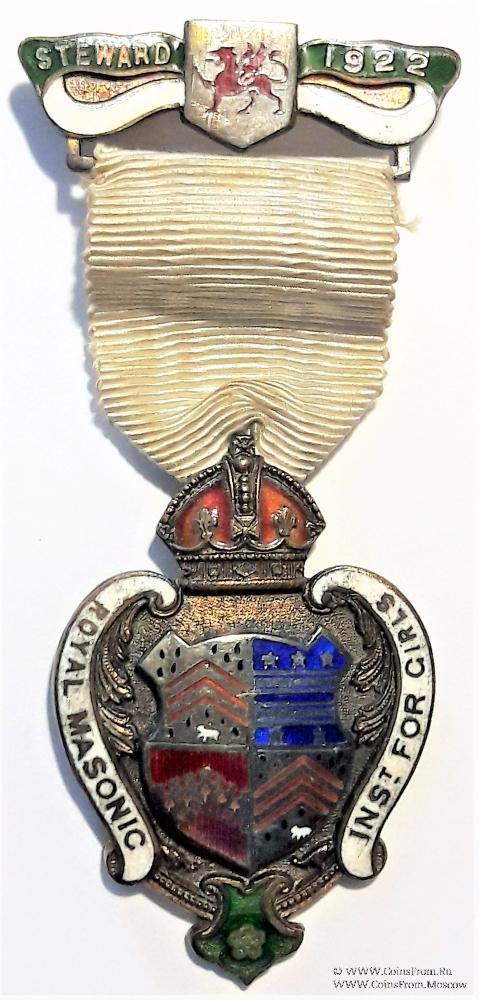 Цвет ленты белый. Колодка бело-зелёной (цвет флага Уэльса) эмали с надписью STEWARD, датой 1922 и булавкой для ношения с обратной стороны. в центре колодки малый герб, в виде щита с изображением красного дракона – символ Уэльса. Уэльс - Страна, одна из четырёх главных административно-политических частей Соединённого Королевства Великобритании и Северной Ирландии.