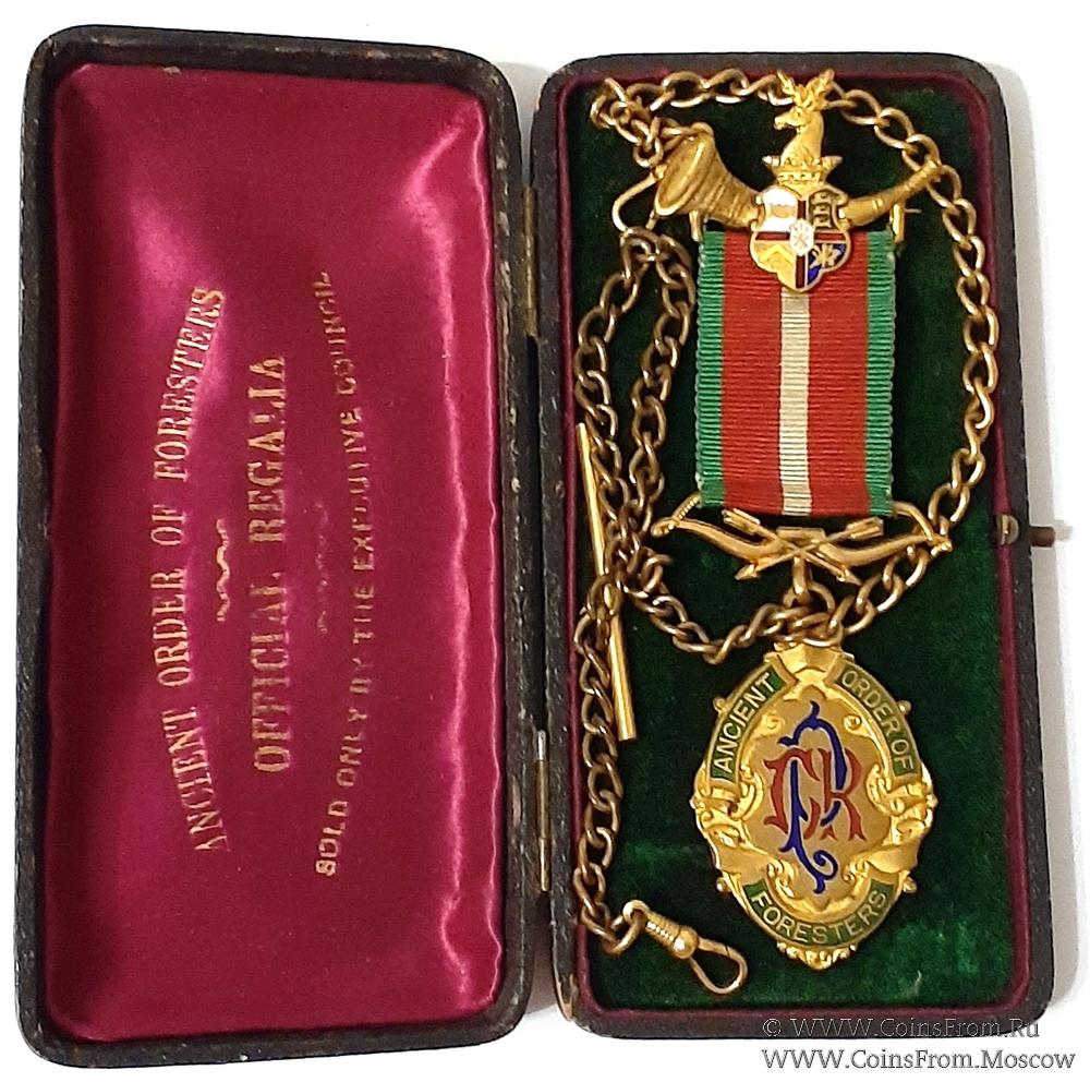 Аверс: лента зелёного цвета овальной формы с наименованием Ордена ANCIENT ORDER OF FORESTERS - Древний Орден Лесников. В центре вязь из букв P.C.R. Past Chief Ranger - Прошлый Главный Рейнджер. Знак украшен цепочкой с карабинами на концах и специальным креплением.
