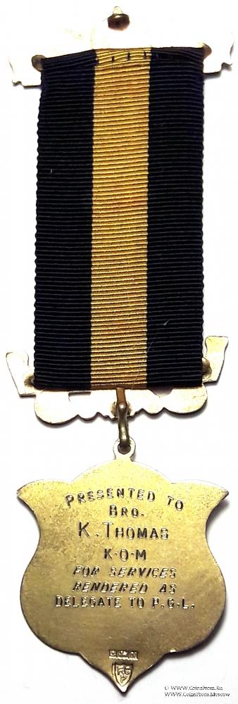 Знак в форме стилизованного щита с выгравированным орнаментом. В центре щита голова буйвола, окружённая синей подвязкой из ремня с надписью девиза Ордена NEMO MORTALIUM OMNIBUS HORIS SAPIT(Латынь) – Никто из смертных не бывает всякий час благоразумен, никакой человек не может быть умен всегда. Гравировка на реверсе знака: PRESENTED TO BRO. K. THOMAS K.O.M. FOR SERVICES RENDERED AS DELEGATE TO P.G.L. – вручён Брату K. THOMAS (KNIGHT ORDER OF MERIT) – рыцарю ордена заслуг за работу в качестве делегата Великой Провинциальной Ложи.