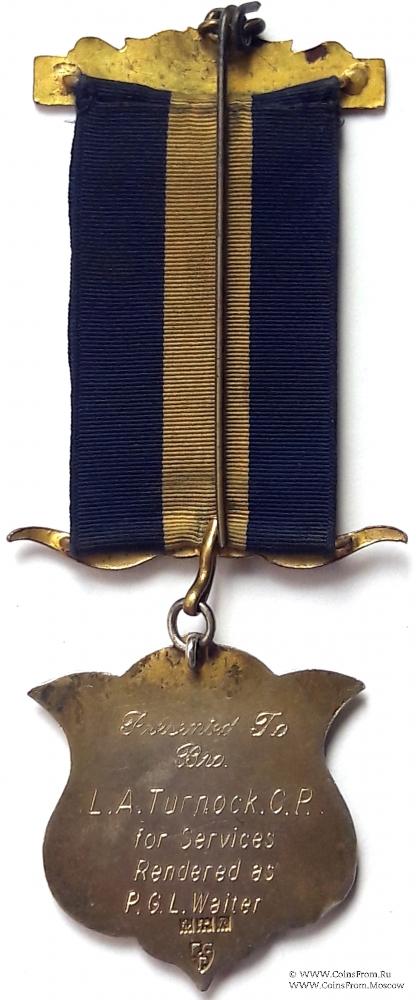 Реверс: гравировка: PRESENTED TO BRO. L.A. TURNOCKC.P. FOR SERVICES RENDERED AS P.G.L. WAITER – вручён Брату L.A. TURNOCK Сертифицирован Примо (CP) за работу в качестве официанта Великой Провинциальной Ложи. Клейма: FCP якорь, лев, Р. Выпуск: Бирмингем. Год выпуска: 1964.