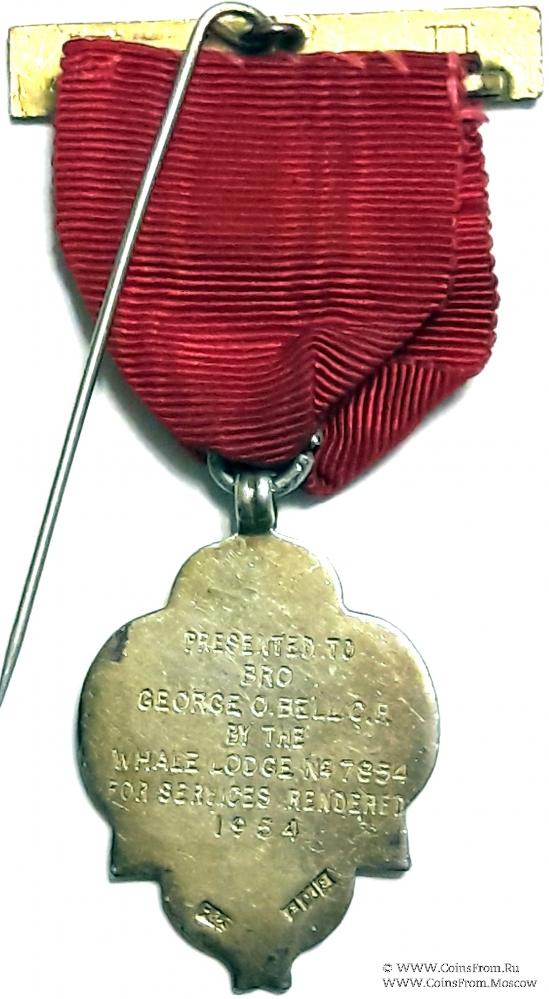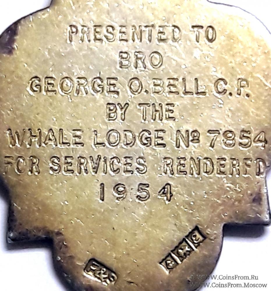 Гравировка на реверсе знака: Presented to Bro. GEORGE O.BELL C.P. by the WHALE LODGE 7954 FOR SERVICES RENDERED 1954 – Вручён Брату GEORGE O.BELL сертифицировано первый за службу в 1954 году.