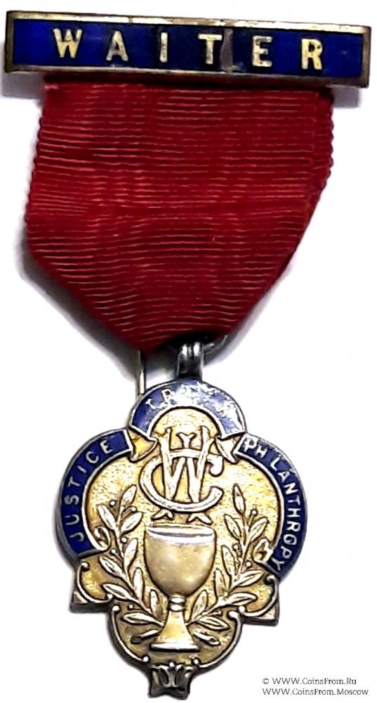 Верхняя колодка прямоугольная синей эмали с надписью WAITER – официант и иглой для носки с обратной стороны. Нижняя колодка должна быть в форме ленты на фоне орнамента с названием и номером Ложи и кольцом для знака. На данном знаке нижняя колодка отсутствует.