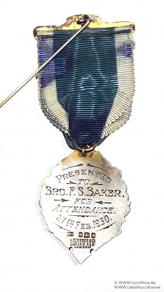 Страна: Англия. Материал: серебро, позолота, эмаль Клейма: LS L.Simpson&Co, 56 York R № London, O, лев, голова Выпуск: Лондон. Год выпуска: 1930. Форма: медаль.