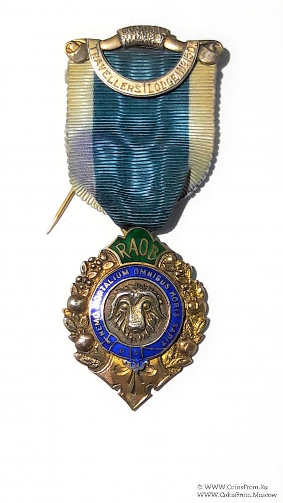 Лента небесно-голубая с белыми полосами по бокам. Верхняя колодка в виде рогов буйвола с перекинутой лентой и надписью названия и номера Ложи Travellers Lodge № 50. Игла для ношения с обратной стороны. В низу лента продета непосредственно в кольцо знака.