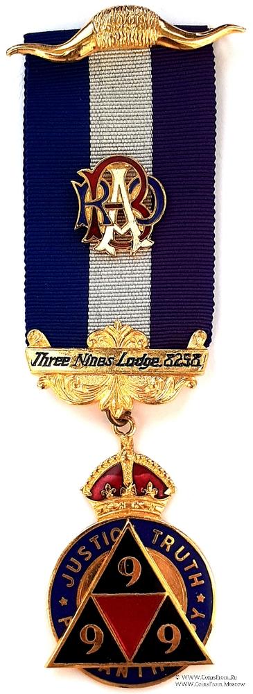 Колодки/медальон: верхняя колодка в виде рогов буйвола. Нижняя колодка в виде прямоугольника на фоне стилизованного орнамента с наименованием и номером Ложи Three Nines Lodge 8258. В центре ленты медальон, представляющий собой вязь из разноцветных букв RAOB.