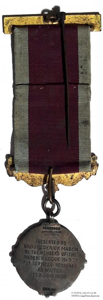 Реверс: гравировка: Presented to Bro. Frederick Mason by the members of Phoenix Lodge № 937 for services Rendered as Waiter Feb. 20 1928. – Вручён Брату Frederick Mason от членов Ложи за услуги официанта 20 февраля 1928 г. Клейма: № 362900 Fattorini&sons, Bradford. Sterling, F&S.нет. Выпуск: 1928 г.