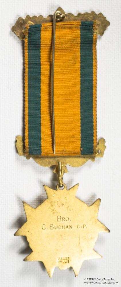 Знак в виде мальтийского креста с пятью лучами на фоне венка. В центре петля из ремня синей эмали с надписью на латыни NEMO MORTALIUM OMNIBUS HORISS APIT (Латынь) – Никто из смертных не бывает всякий час благоразумен, никакой человек не может быть умен всегда и головой буйвола в середине. Гравировка на реверсе знака BRO.C. BUCHAN C.P (C.P. – CERTIFIED PRIMO– сертифицировано первый).