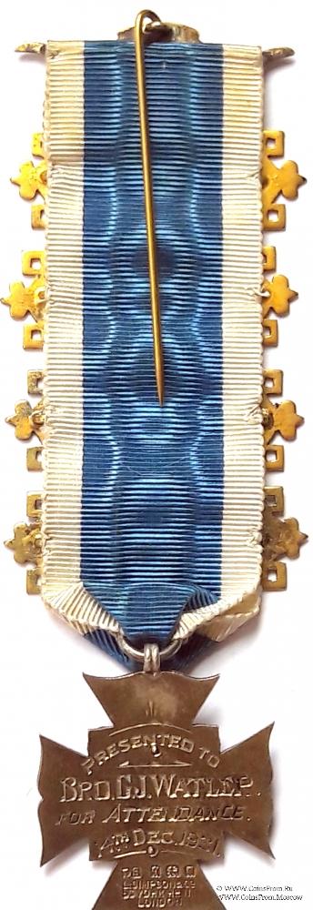 Реверс: гравировка: Presented to Bro. G.J. Watler for Attendance 14 Dec. 1931 – вручён Брату G.J. Watler за посещаемость 14 декабря 1931 года. Клейма: LS L.Simpson&Co, 56 York R № 1, London, g, лев, голова Выпуск: Лондон. Год выпуска: 1931.
