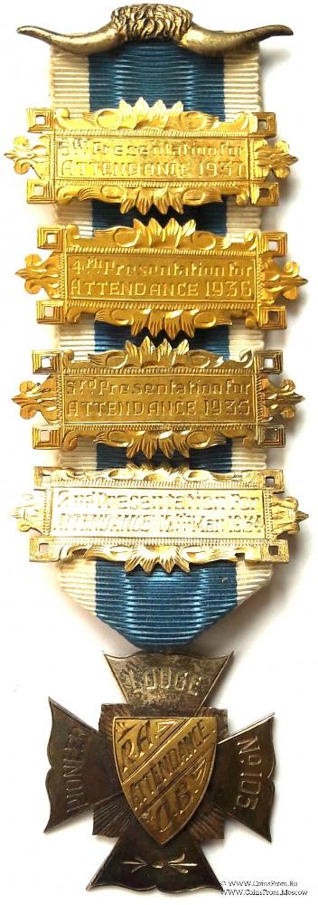 Аверс: в виде креста. На лучах креста название и номер Ложи PIONEER LODGE № 105 в центре креста на щите аббревиатура ордена RAOB и надпись по диагонали ATTENDANCE (посещаемость).