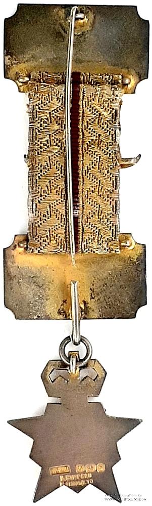 КОЛОДКИ/МЕДАЛЬОН: верхняя и нижняя колодки одинаковые в форме прямоугольника с вырезанными углами золотого цвета. Надписи и рамки синего цвета. На верхней колодке – Presented to Pr. D. Hanson. На нижней колодке – Apr. 22nd 1948. John Palmer Lodge. В центре ленты металлический медальон в виде объёмной головы буйвола.