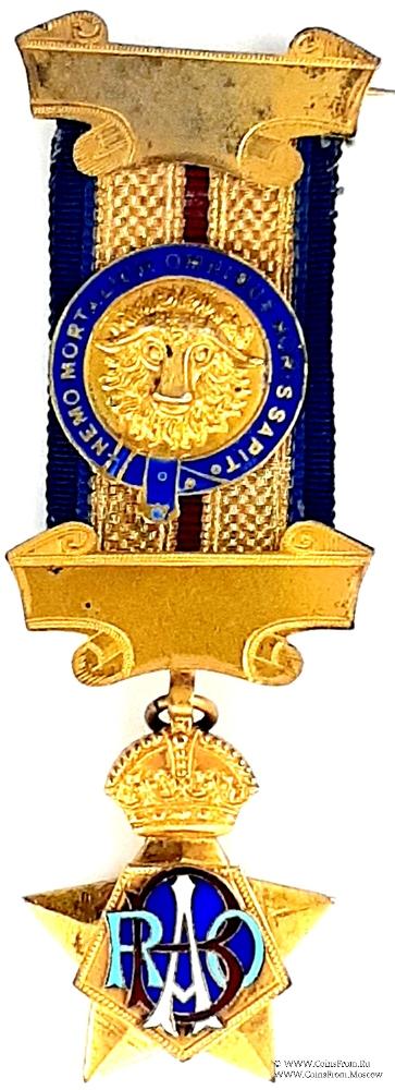 АВЕРС: в виде пятиконечной звезды, увенчанной короной. В центре на пятиугольнике, размещённом вершиной вниз вязь из букв аббревиатуры Ордена RAOB. Буквы RO – голубые, буква А – белая, В - красная.