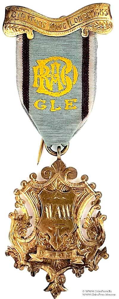 КОЛОДКИ/МЕДАЛЬОН: верхняя колодка в виде ленты с наименованием и номером Ложи – Sir Thos King Lodge 3683.