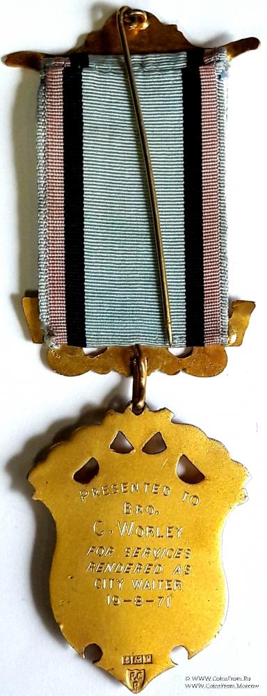 Реверс: гравировка: Presented to Bro. C. Worley for services Rendered as City Waiter 19.8.71. – Вручён Брату C. Worley за услуги в качестве Городского Официанта 19.8.1971 г. Клейма: F.C.P. якорь, лев, v. Выпуск: Бирмингем. Год выпуска: 1970 г.