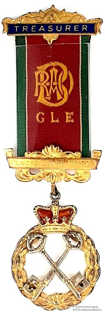 КОЛОДКИ/МЕДАЛЬОН: верхняя колодка прямоугольная, синей эмали на фоне орнамента с надписью – Treasurer – казначей. Нижняя колодка в виде ленты на фоне орнамента с наименованием и номером Ложи - Wilmore Lodge № 9883.
