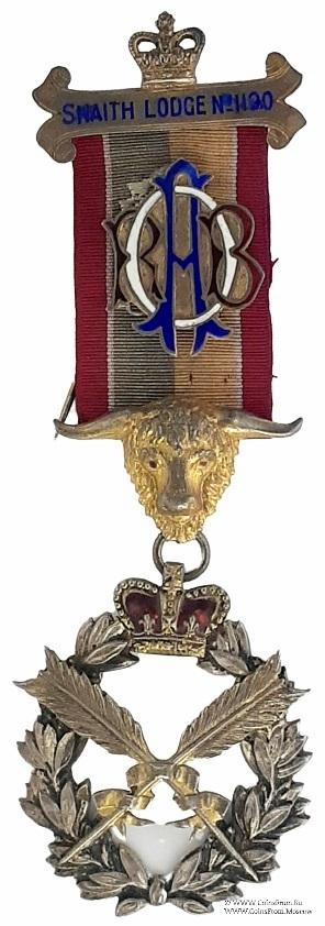 КОЛОДКИ/МЕДАЛЬОН: верхняя колодка с наименованием Ложи: Snaith Lodge № 1190. Нижняя колодка в виде объёмной головы буйвола. Медальон в виде вязи из букв аббревиатуры Ордена (RAOB).
