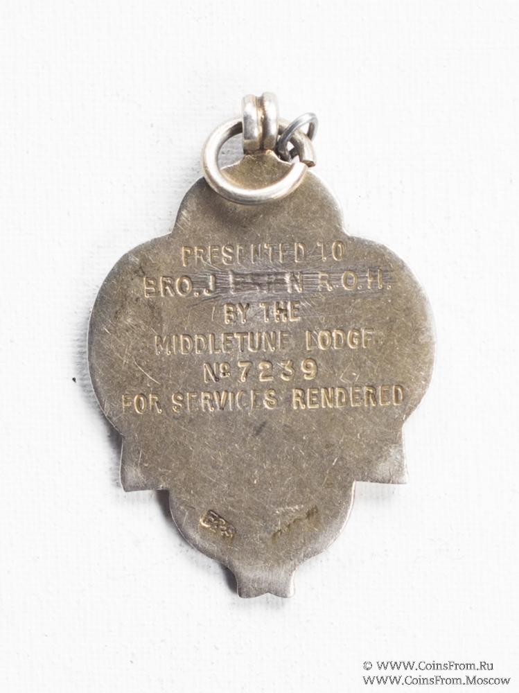 Гравировка на реверсе знака - Presented to Bro. J.ORIFN R.O.H. (Roll Of Honour) by the Middletune Lodge № 7239 for services Rendered – Вручён Брату J.ORIFN кавалеру Ордена Свиток Чести (досточтимому сэру) за оказанные услуги в ложе № 7239.