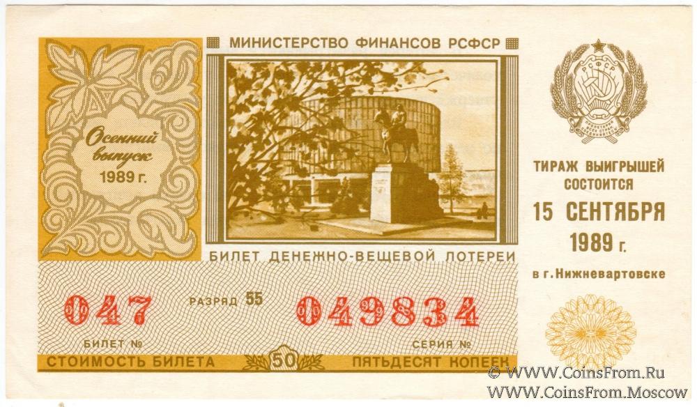 Билет. Осенний выпуск. Тираж в г. Нижневартовске. Денежно-вещевая лотерея 1989 г.