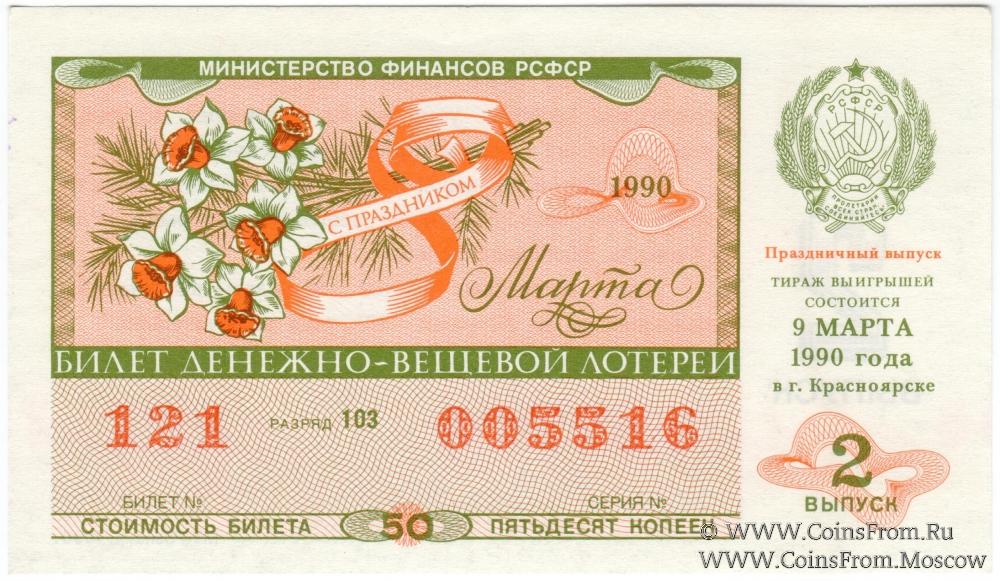 Билет. Выпуск 2. Праздничный выпуск - "8 марта". Тираж в г. Красноярске. Денежно-вещевая лотерея 1990 г.