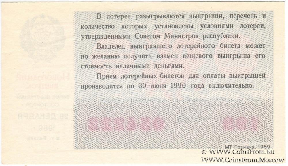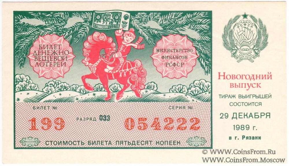 Билет. Новогодний выпуск. Тираж в г. Рязани. Денежно-вещевая лотерея 1989 г.