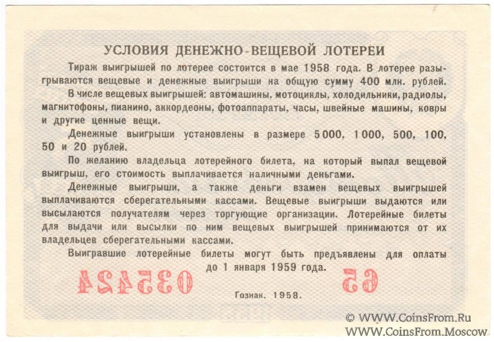 Лотерейный билет. Денежно-вещевая лотерея 1958 г.