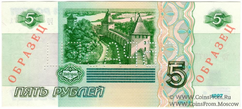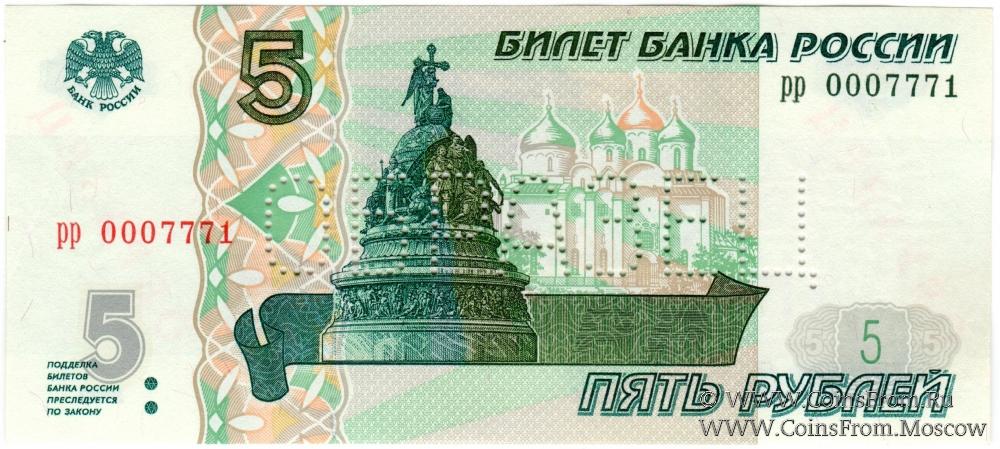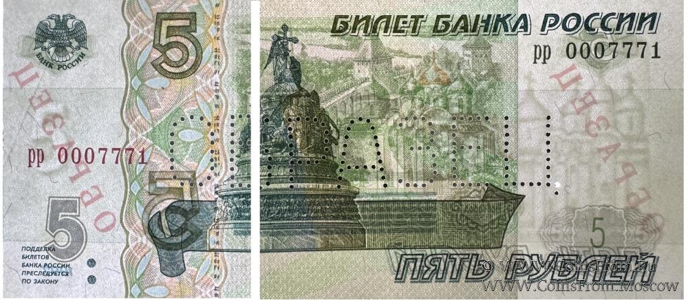 Билет Банка России образца 1997 г. Выпуск 1997 г. ОБРАЗЕЦ двусторонний: горизонтальная перфорация слова "ОБРАЗЕЦ"; диагональная надпечатка красного цвета "ОБРАЗЕЦ" дважды на реверсе. Серия рр, номер произвольный. ГОЗНАК.