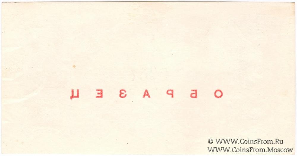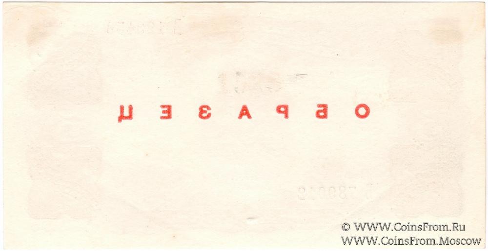 ОБРАЗЕЦ (аверс и реверс отдельно): горизонтальная надпечатка красного цвета "ОБРАЗЕЦ" на аверсе (на реверсе зеркально). 1-й выпуск (серии А - Я). Литера В (кассир - Костенко).