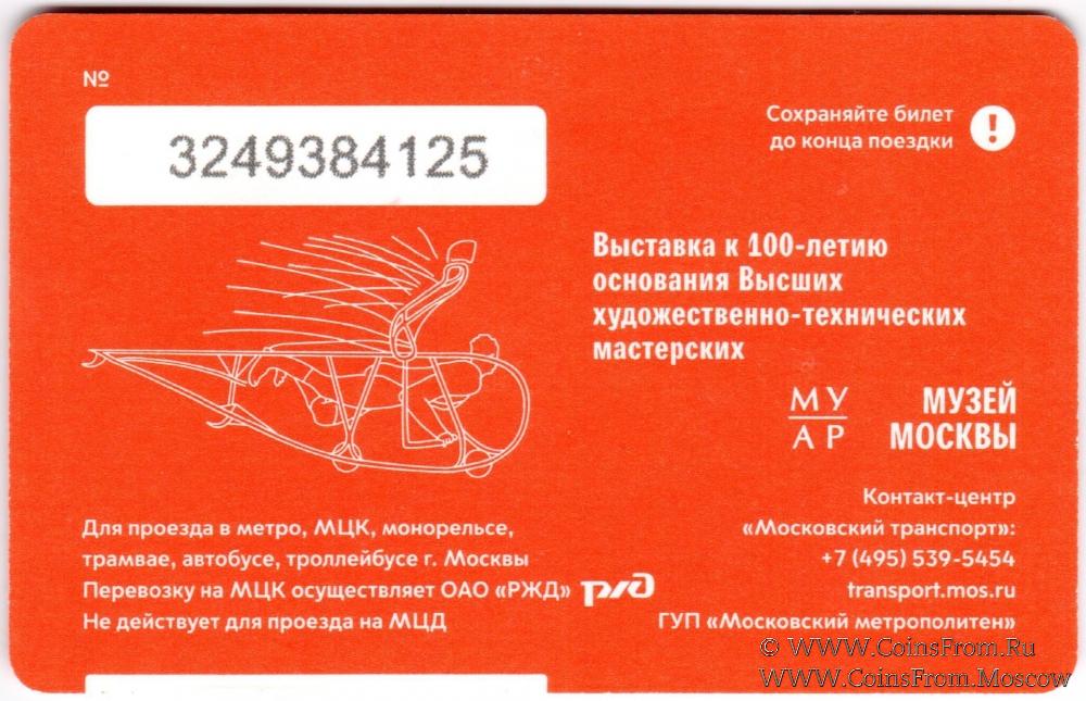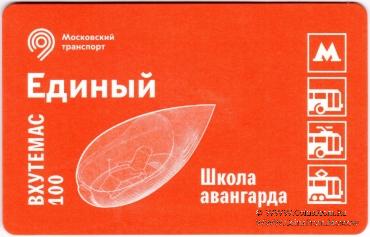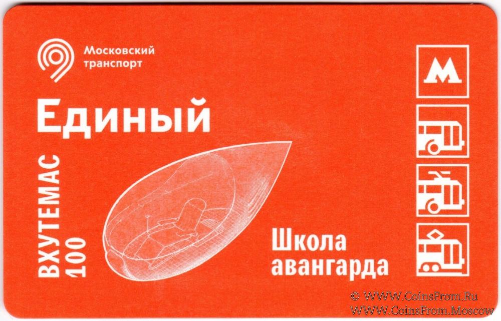 Билет "Единый". Размер: 85,5 * 54 мм. Выпуск билета приурочен к открытию 10 ноября 2020 года в Музее Москвы масштабной экспозиции "ВХУТЕМАС 100. Школа авангарда", посвящённой юбилею Высших художественно-технических мастерских — главного творческого института страны, определившего путь дизайнерского образования в России в XX веке. На карте изображена транспортная капсула из дипломного проекта "Город будущего (эволюция архитектурных принципов в планировке городов и организации жилища)", выполненного Георгием Крутиковым в 1928 году.