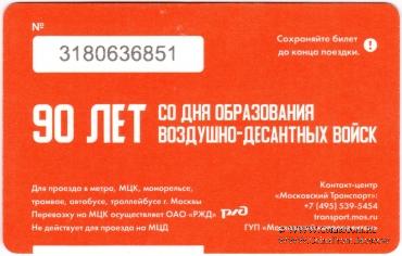 Билет "Единый". Размер: 85,5 * 54 мм. Билет выпущен к 90-летию со дня образования Воздушно-десантных войск (ВДВ).