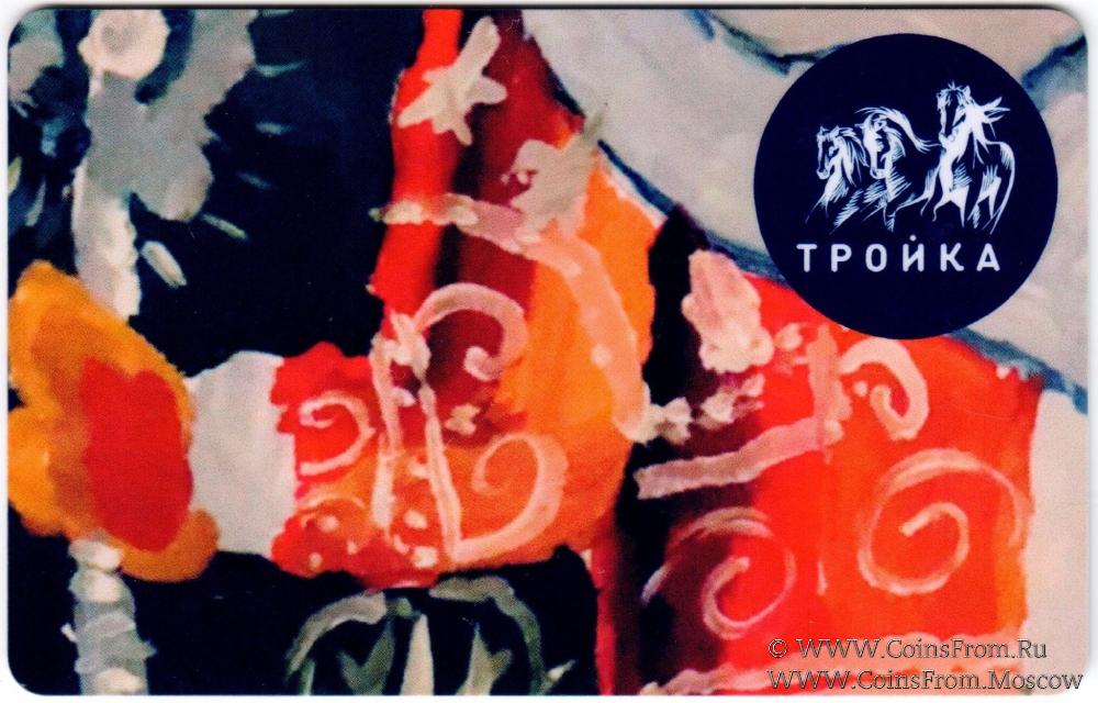 Электронная транспортная карта "Тройка". Размер: 85,5 * 54 мм. Карта "Тройка" из серии "Детские рисунки", состоящей из 13 разновидностей. Каждый вид реализовывался на отдельной линии в кассах станций метро и автоматах по продаже билетов. Вариант 1 (реализация на Арбатско-Покровской линии).