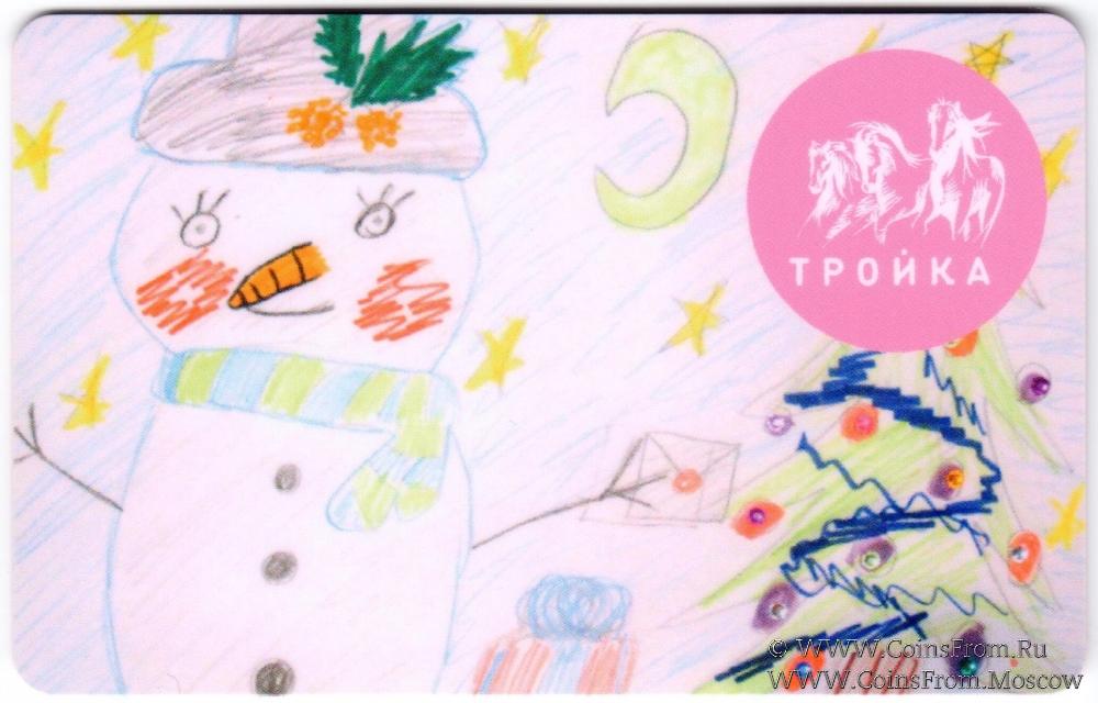 Электронная транспортная карта "Тройка". Размер: 85,5 * 54 мм. Карта "Тройка" из серии "Детские рисунки", состоящей из 13 разновидностей. Каждый вид реализовывался на отдельной линии в кассах станций метро и автоматах по продаже билетов. Вариант 2 (реализация на Большой Кольцевой и Некрасовской линиях).