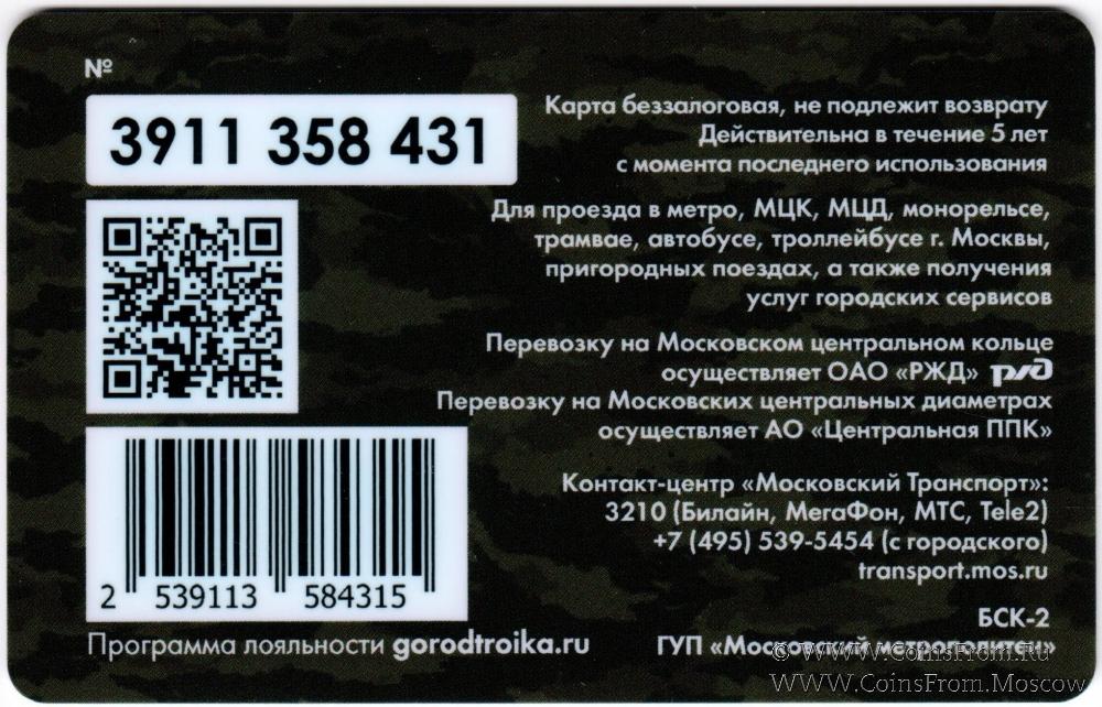 Карта сувенирная (3911) беззалоговая, не подлежит возврату. Для проезда в метро, МЦК, МЦД, монорельсе, трамвае, автобусе, троллейбусе г. Москвы, пригородных поездах, а также получения услуг городских сервисов.