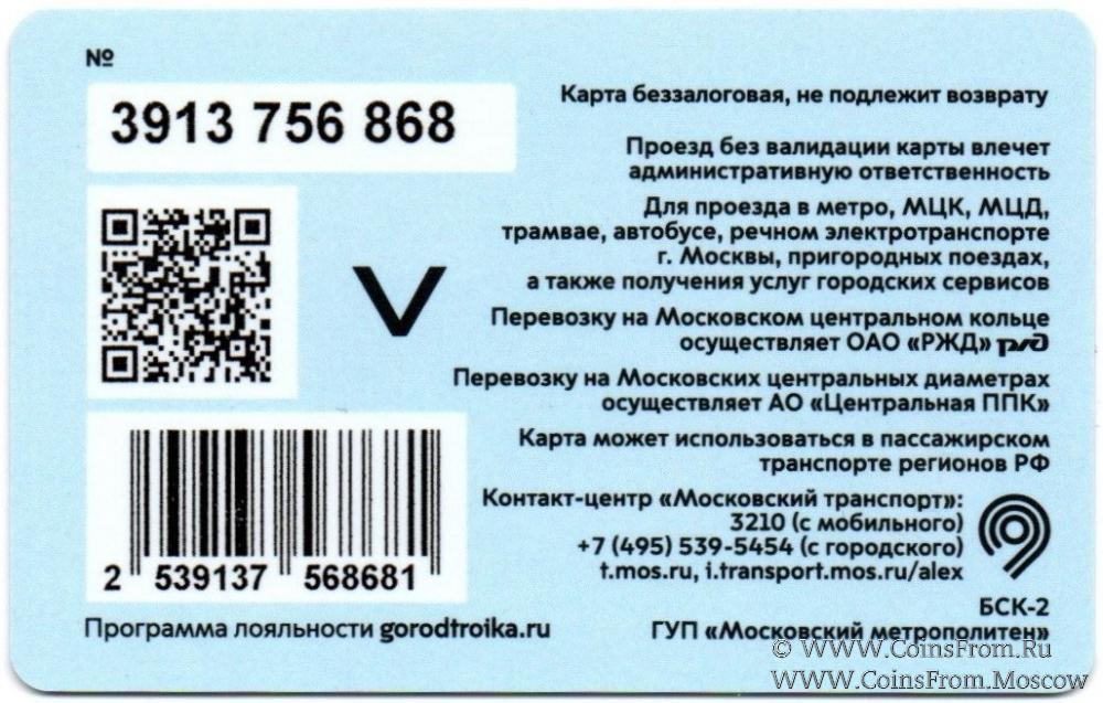 Карта сувенирная (3913) беззалоговая, не подлежит возврату. Проезд без валидации карты влечет административную ответственность. Для проезда в метро, МЦК, МЦД, монорельсе, трамвае, автобусе, речном электротранспорте г. Москвы, пригородных поездах, а также получения услуг городских сервисов.
