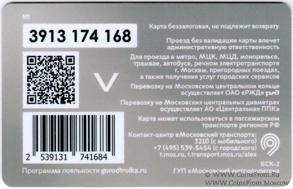 Карта беззалоговая (3913), не подлежит возврату. Проезд без валидации карты влечет административную ответственность. Для проезда в метро, МЦК, МЦД, монорельсе, трамвае, автобусе, речном электротранспорте г. Москвы, пригородных поездах, а также получения услуг городских сервисов.