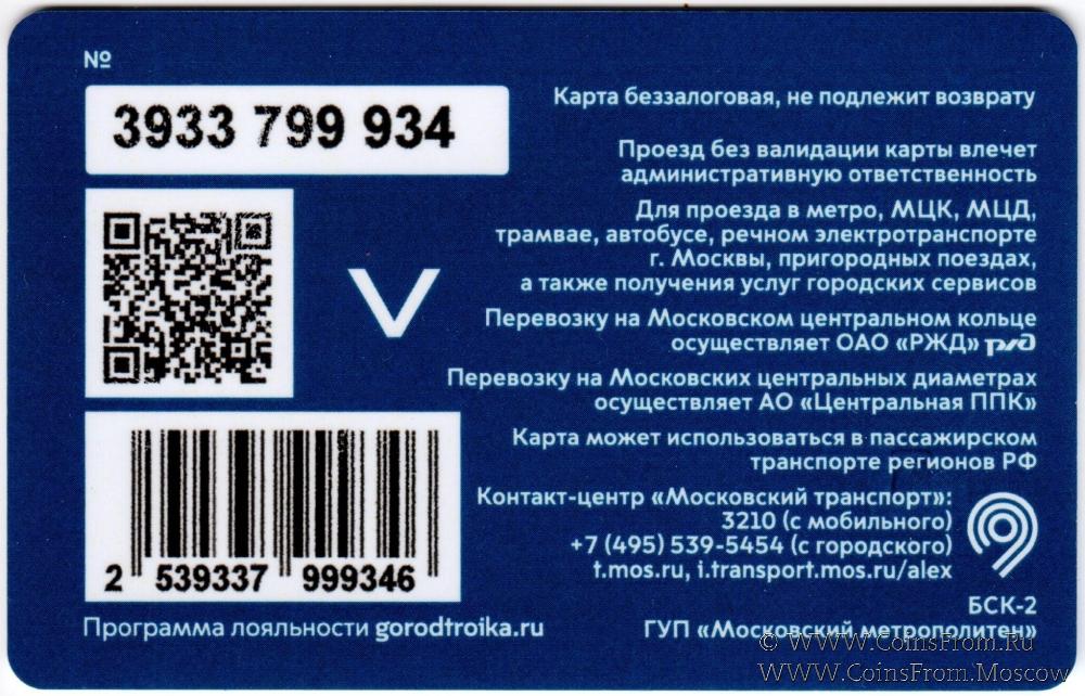 Карта подарочная (3933) беззалоговая, не подлежит возврату. Проезд без валидации карты влечет административную ответственность. Для проезда в метро, МЦК, МЦД, трамвае, автобусе, речном электротранспорте г. Москвы, пригородных поездах, а также получения услуг городских сервисов.