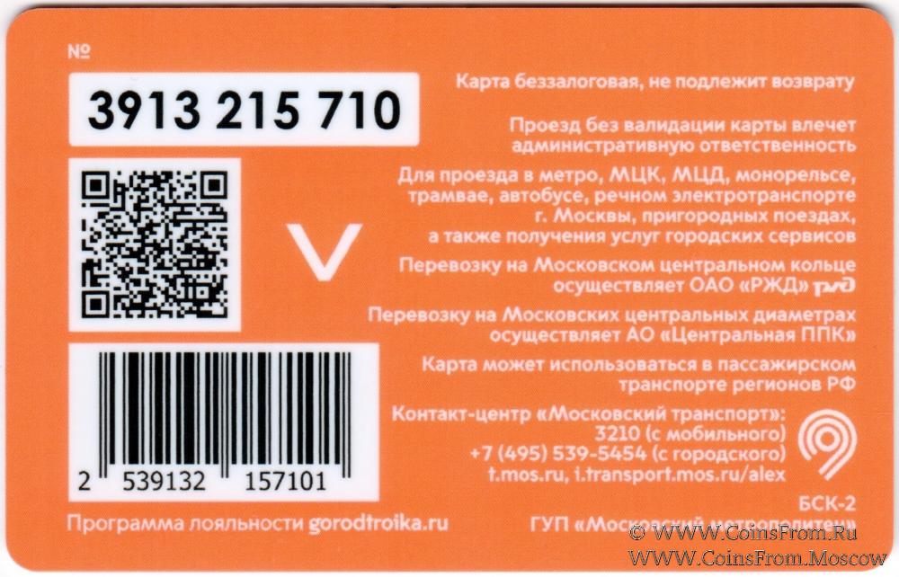 Карта сувенирная (3913) беззалоговая, не подлежит возврату. Проезд без валидации карты влечет административную ответственность. Для проезда в метро, МЦК, МЦД, монорельсе, трамвае, автобусе, речном электротранспорте г. Москвы, пригородных поездах, а также получения услуг городских сервисов.