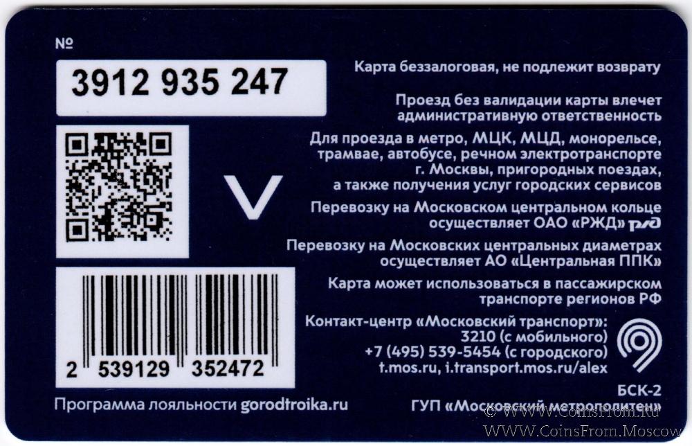 Карта беззалоговая (3912), не подлежит возврату. Проезд без валидации карты влечет административную ответственность. Для проезда в метро, МЦК, МЦД, монорельсе, трамвае, автобусе, речном электротранспорте г. Москвы, пригородных поездах, а также получения услуг городских сервисов.