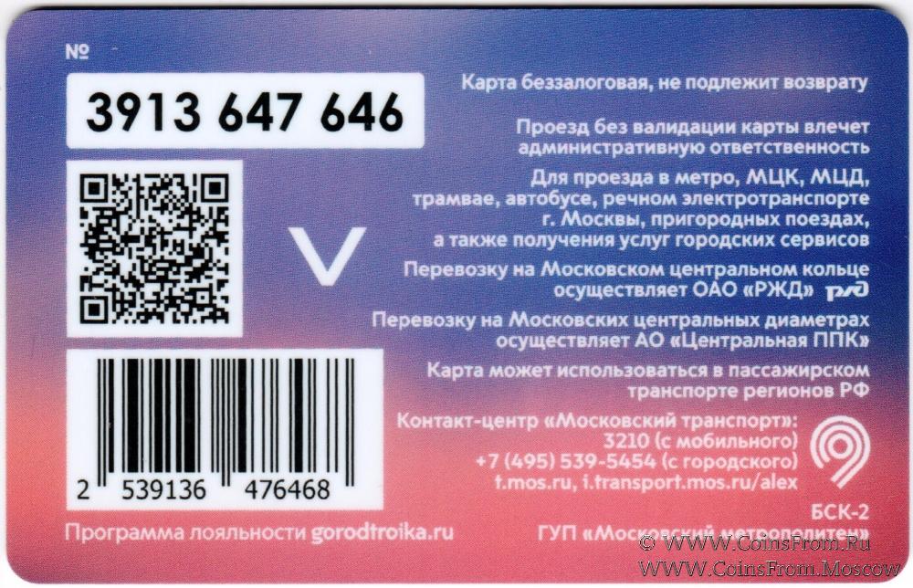 Карта сувенирная (3913) беззалоговая, не подлежит возврату. Проезд без валидации карты влечет административную ответственность. Для проезда в метро, МЦК, МЦД, трамвае, автобусе, речном электротранспорте г. Москвы, пригородных поездах, а также получения услуг городских сервисов.