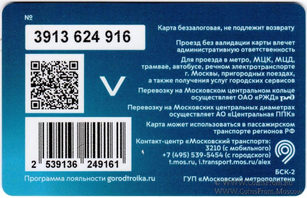 Карта подарочная (3913) беззалоговая, не подлежит возврату. Проезд без валидации карты влечет административную ответственность. Для проезда в метро, МЦК, МЦД, монорельсе, трамвае, автобусе, речном электротранспорте г. Москвы, пригородных поездах, а также получения услуг городских сервисов.