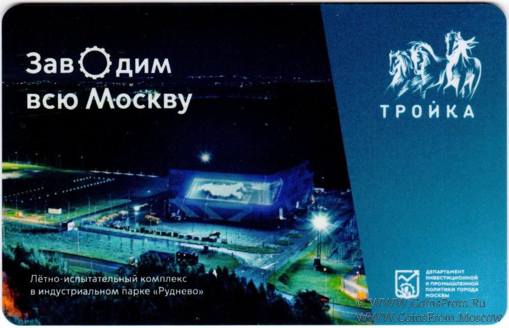 Электронная транспортная карта "Тройка". Размер: 85,5 x 54 мм. Серия подарочных карт "Тройка", выпущенных к ПМЭФ-2025: "Заводим всю Москву" – Лётно-испытательный комплекс в индустриальном парке "Руднево". Подарочный вариант в буклете.