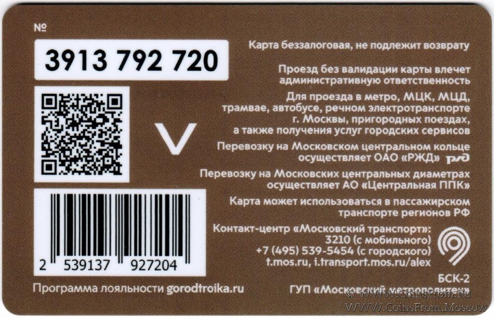 Карта сувенирная (3913) беззалоговая, не подлежит возврату. Проезд без валидации карты влечет административную ответственность. Для проезда в метро, МЦК, МЦД, трамвае, автобусе, речном электротранспорте г. Москвы, пригородных поездах, а также получения услуг городских сервисов.