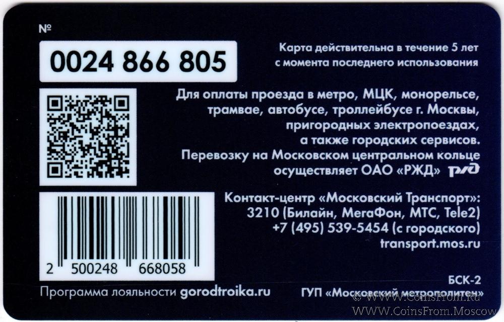 Карта залоговая (0024), действительна в течение 5 лет с момента последнего использования. Для оплаты проезда в метро, МЦК, монорельсе, трамвае, автобусе, троллейбусе г. Москвы, пригородных электропоездах, а также городских сервисов.