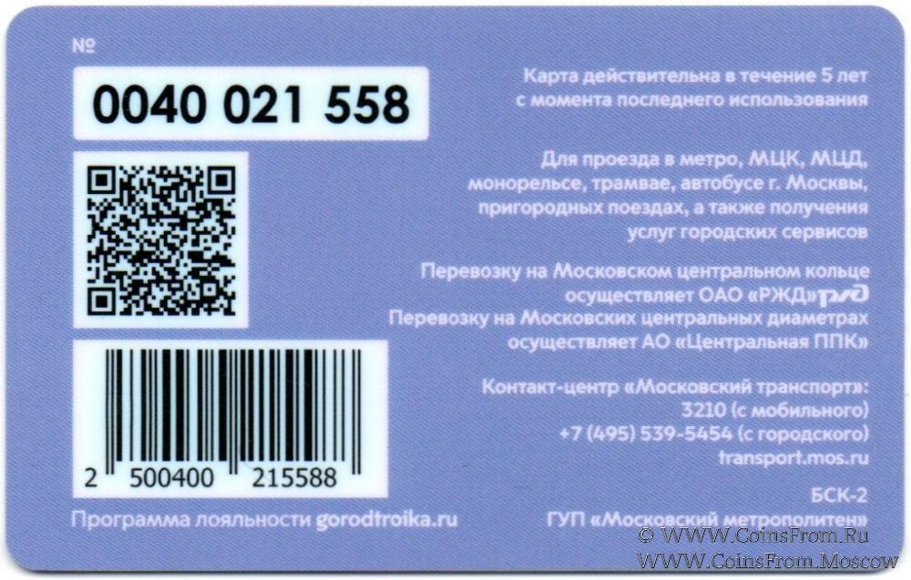 Карта залоговая (0040). Для проезда в метро, МЦК, МЦД, монорельсе, трамвае, автобусе г. Москвы, пригородных поездах, а также получения услуг городских сервисов.