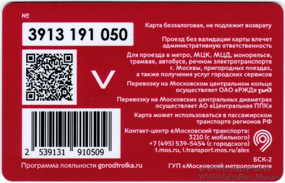 Карта сувенирная (3913) беззалоговая, не подлежит возврату. Проезд без валидации карты влечет административную ответственность. Для проезда в метро, МЦК, МЦД, монорельсе, трамвае, автобусе г. Москвы, пригородных поездах, а также получения услуг городских сервисов.