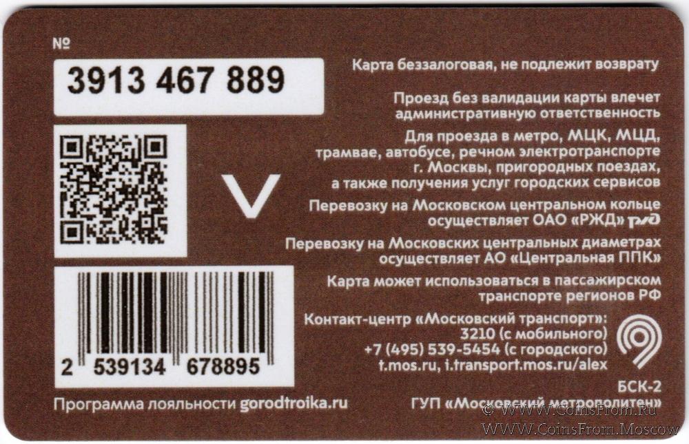 Карта сувенирная (3913) беззалоговая, не подлежит возврату. Проезд без валидации карты влечет административную ответственность. Для проезда в метро, МЦК, МЦД, трамвае, автобусе, речном электротранспорте г. Москвы, пригородных поездах, а также получения услуг городских сервисов.