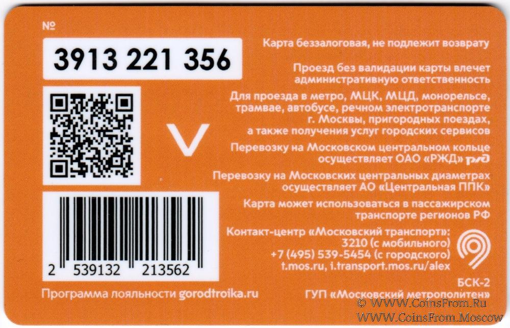 Карта беззалоговая сувенирная (№ 3913), не подлежит возврату. Для проезда в метро, МЦК, МЦД, монорельсе, трамвае, автобусе, речном автотранспорте г. Москвы, пригородных поездах, а также получения услуг городских сервисов.