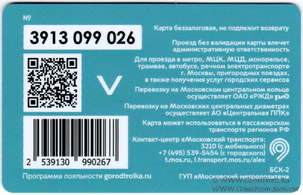 Карта беззалоговая (№ 3913), не подлежит возврату. Проезд без валидации карты влечет административную ответственность. Для проезда в метро, МЦК, МЦД, монорельсе, трамвае, автобусе г. Москвы, пригородных поездах, а также получения услуг городских сервисов.